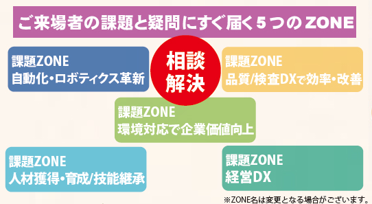 - 各ブロックをテーマ別に構成。来場者が自社課題に合ったPRブースを自ら選択して訪問。効率的な商談を実現。